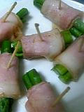 ゆでたアスパラをベーコンで巻いて、焼く。